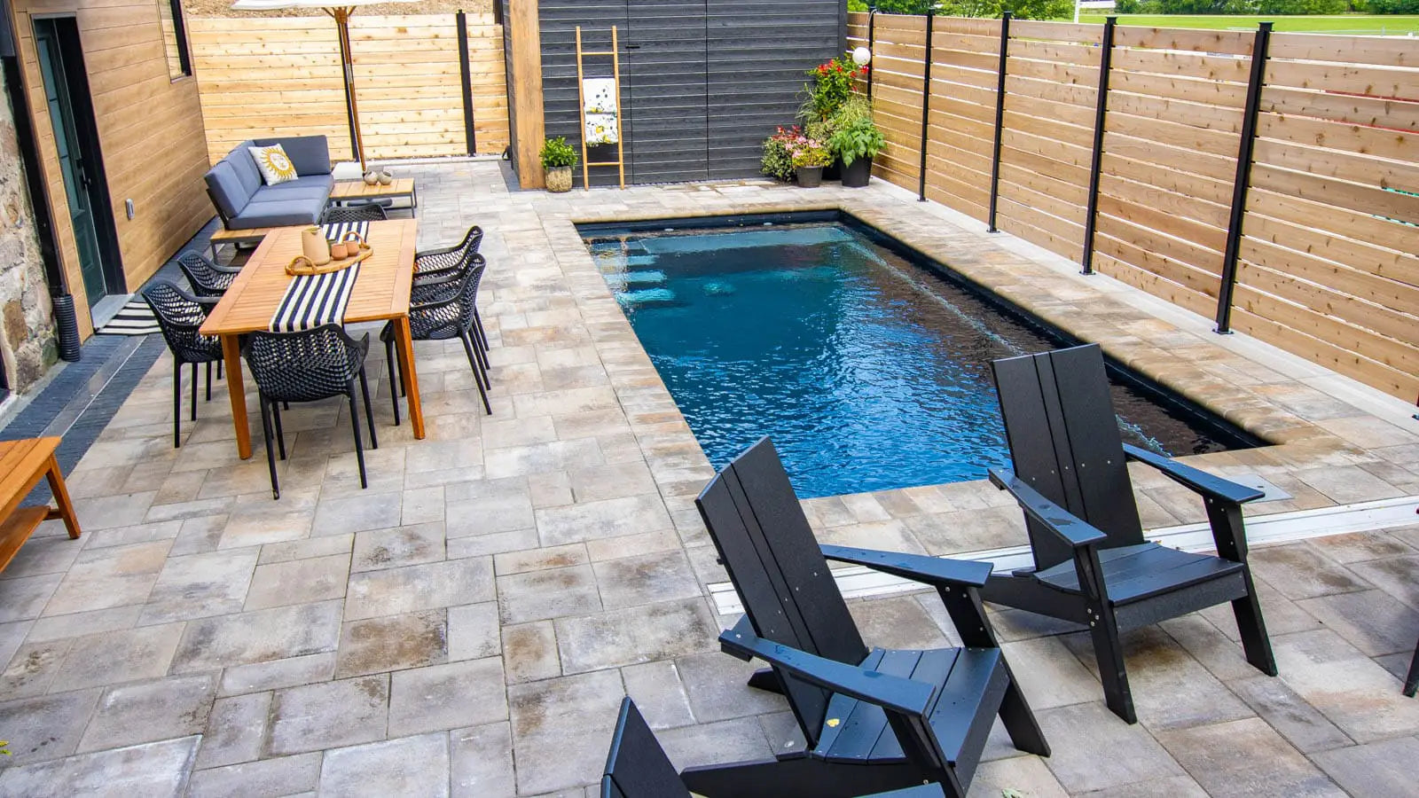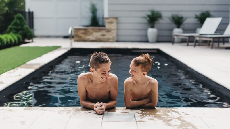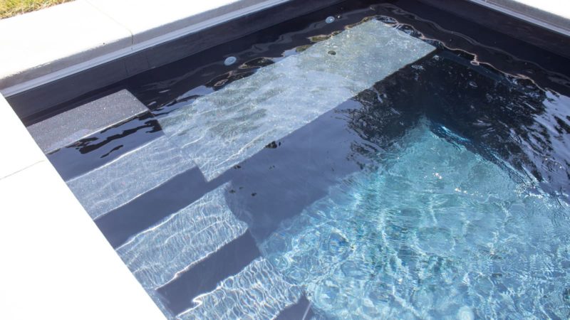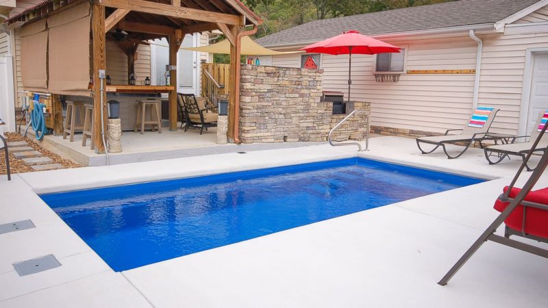 A remarkable pool that can provide luxury and grace in limited backyards With four length options (starting at 16 feet and ending at 26 feet,) it offers a full width bench (10 feet) at the entry area and a generous swimming area inside it. This pool is often complimented with generous greenery and landscaping along with the potential for tile along the sides of the pool for a unique, stylish look.